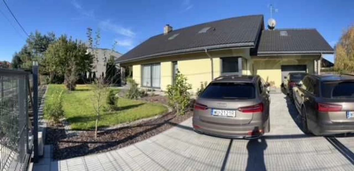 Jednokondygnacyjny dom o powierzchni użytkowej 167,69 m2 oraz powierzchni zabudowy 208,11 m2, usytuowany jest na działce o powierzchni około 942 m2. Obszar wokół budynku został starannie zaaranżowany, z bogatą roślinnością, trawnikiem i miejscem zabaw dla najmłodszych. Duży taras, wyłożony kostką brukową, harmonijnie współgra z architekturą budowli. Nieruchomość jest ogrodzona, a brama wjazdowa sterowana pilotem. Dodatkowo, z tyłu budynku znajduje się praktyczny budynek gospodarczy z drewutnią.