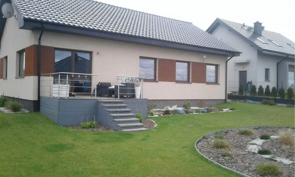 Dom otoczony jest dużą działką, która stanowi idealne miejsce do spędzania czasu na świeżym powietrzu. Ogrzewanie domu odbywa się za pomocą pieca na pellet z systemem grzewczym podłogowym, co zapewnia komfortowe warunki mieszkalne i oszczędność energii.
