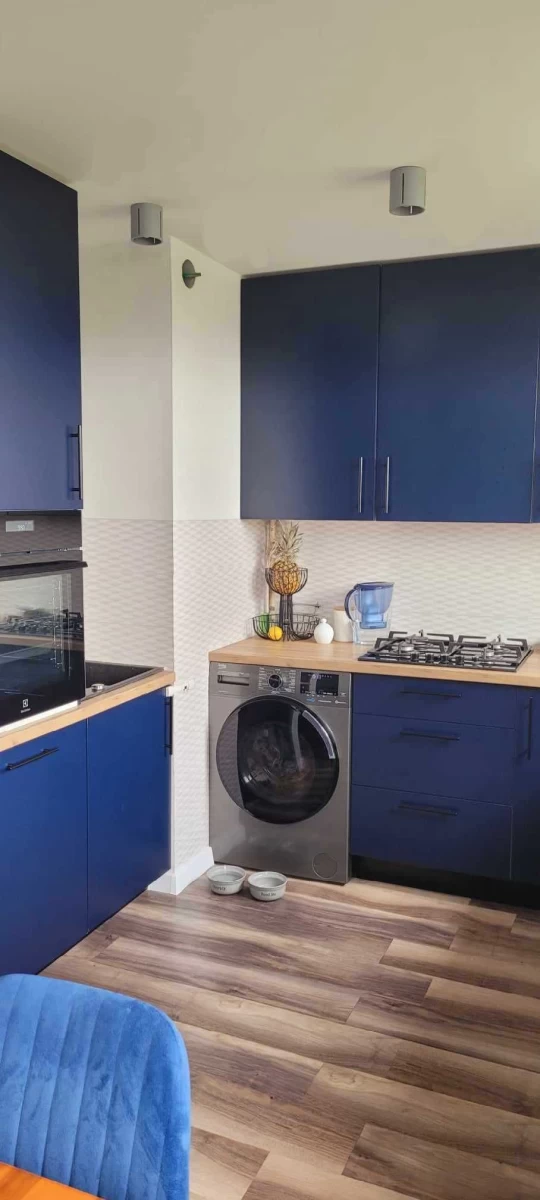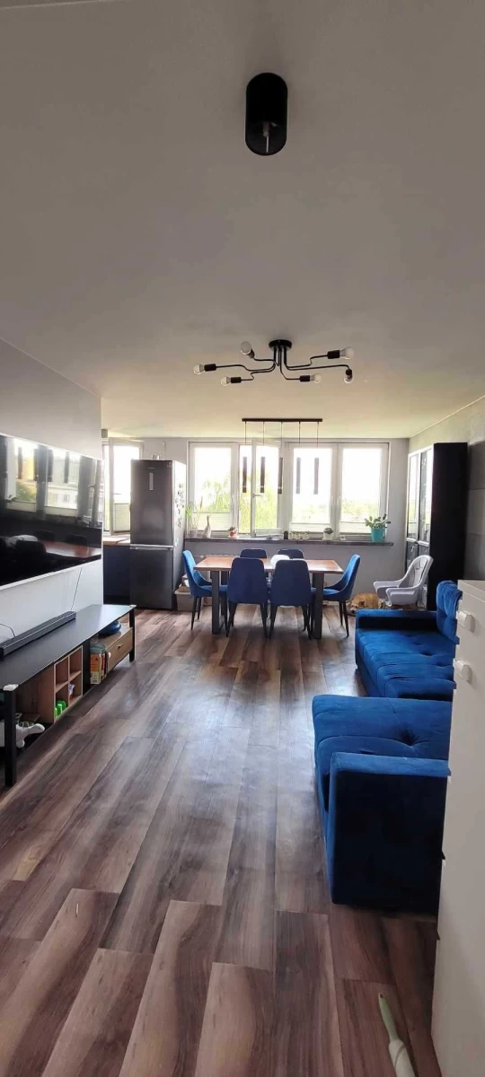 - Mieszkanie przeszło generalny remont w 2021 roku, prezentując nowoczesną kuchnię z pełnym wyposażeniem AGD, połączoną z przestronnym salonem.