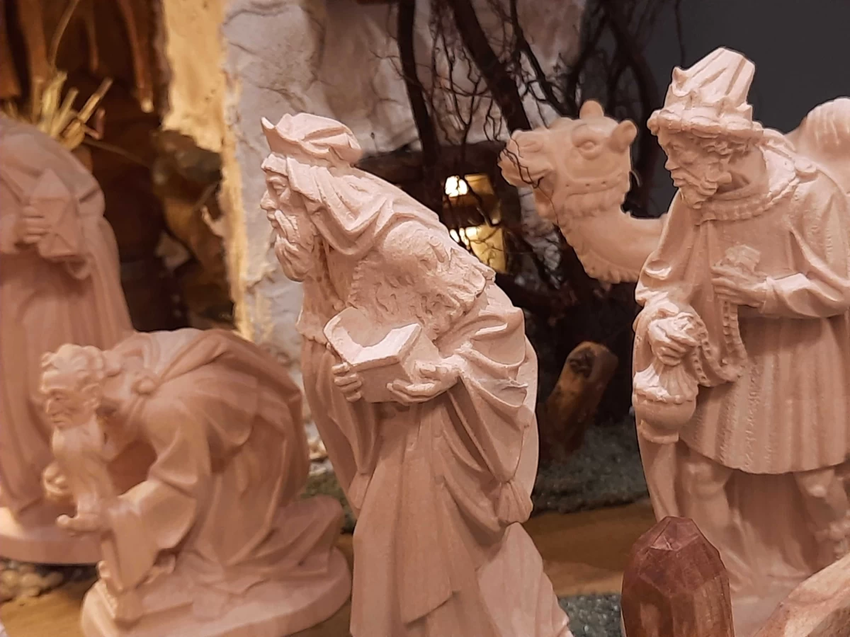 Mam przyjemność zaoferować Państwu wyjątkową drewnianą szopkę z rzeźbionym drewnianym kompletem figur, pochodzącym z renomowanej niemieckiej wytwórni - Bildhauer Holzschnitzerei Dorf Tirol. Każda figurka ma imponującą wysokość 13 cm (postacie stojące), a jej wartość rynkowa to około 50 euro.